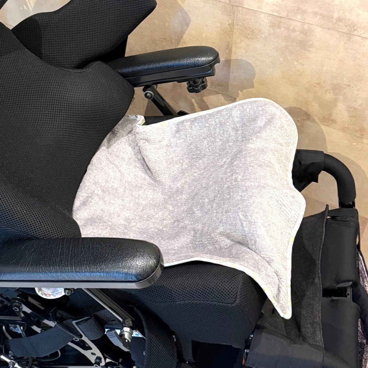 防水タオルを車椅子座面サイズに。腕に置いて食事カバーとして使用する撥水加工カバー。